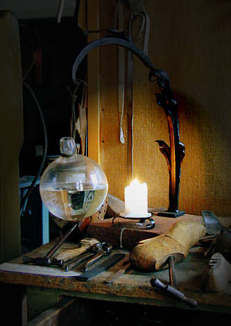 "Schusterkugel" als Lichtquelle: Der Schein einer Kerze wurde durch eine mit Wasser gefüllte Glaskugel gebrochen und auf den Arbeitsplatz verstärkt gerichtet.