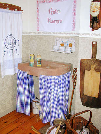 Die Küche Spülstein Zum Geschirrspülen wurde ein Becken aus Sandstein (später Kunststein) benutzt. Der Ausdruck "Spülstein" stirbt mit dem Siegeszug der Edelstahl-Spüle aus. |