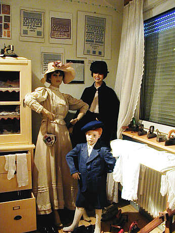 Weißes Baumwollkleid, um 1910 Dunkles Wollcape blauer Knabenanzug, Bleyle, um 1950