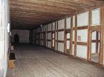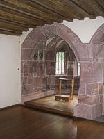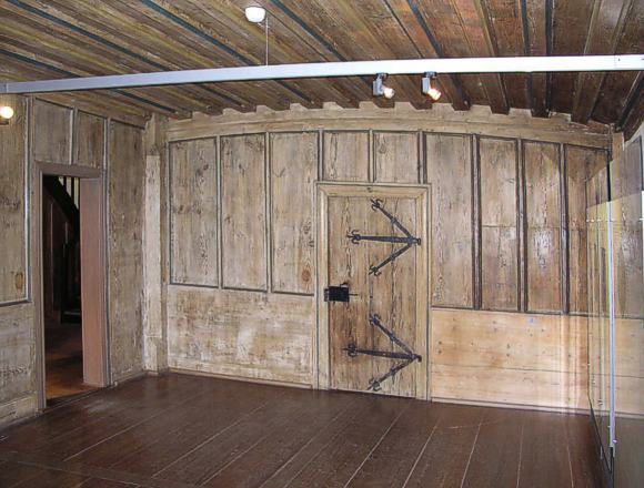 Oben: Abtsstube mit Täfelung aus Holzbohlen mit leicht gesprengter Balkendecke