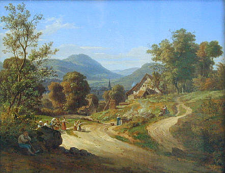 Neckargemünd zu sehen. Fries verwendet zwar den Bildaufbau der klassischen Landschaftsmalerei, jedoch ohne die idealisierende Überhöhung seiner italienischen Landschaftsgemälde. Statt dessen strahlt die Szenerie mit den Figuren bei der Hanfernte eine ländliche Idylle aus. |