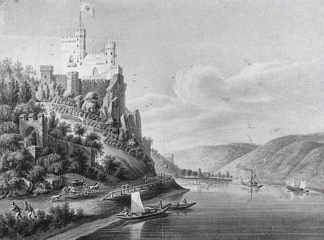 Burg Rheinstein nach der Wiedererrichtung durchdie Hohenzollern. Am linken Rheinufer fährt noch eine Postkutsche, in der Flussmitte ist schon ein Dampfschiff unterwegs.