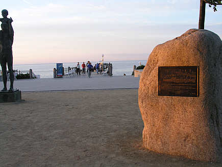 Findling mit einer Inschriftplatte, die an die Wiedererrichtung der Seebrücke als Symbol der deutschen Wiedervereinigung erinnert.