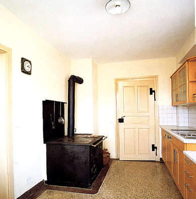 Küche mit eisernem holzbefeuertem Herd, Terrazzoboden und neuer Küchenzeile