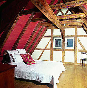 Deshalb blieben die alten Fenster so weit wie möglich an ihrem Platz und wurden zu Kastenfenstern umgebaut. Das Dach ist nun wieder mit historischen Biberschwänzen eingedeckt. Das Obergeschoss erhielt eine außen liegende Dämmung - sein schönes Fachwerk ist jetzt von innen zu sehen.