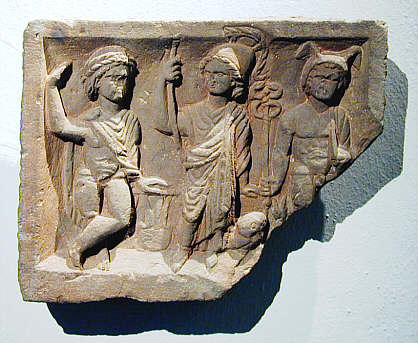 Weihebild zeigt links Apoll mit der Leier, in der Mitte Minerva