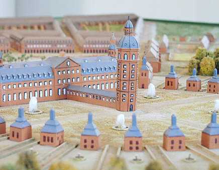 Stadt und Schloss Karlsruhe Stadtmodell Schlossturm als Mittelpunkt der Anlage und umgebende Zirkelpavillons In der ersten Schlossanlage noch mit einer einstöckigen Galerie mit dem Corps de Logis des Schlosses verbunden