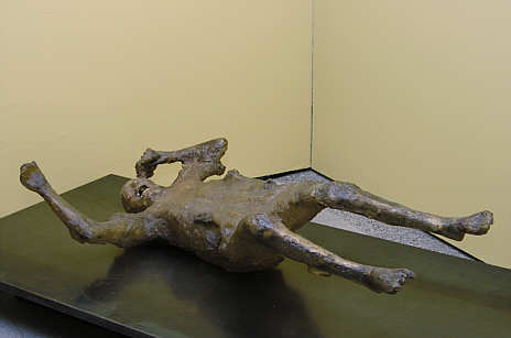 Abguss einer Leiche in Rückenlage, die Hände wie abwehrend nach oben gestreckt