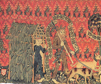 Wilde LeuteWandbehang, Basel, um 1480 Eine Wildfrau im Eingang einer Laubhütte verabschiedet ihren Mann, der mit Hunden auf die Jagd geht.