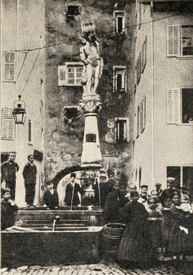 Der Sebastiansbrunnen, im Hintergrund das obere Tor