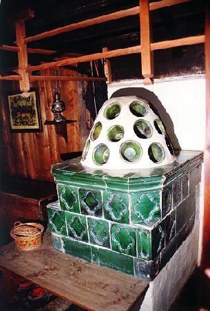 Ecke steht der Kachelofen. Der ist traditionell aus hitzebeständigen