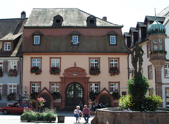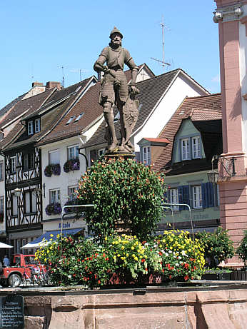 ![]() Marktbrunnen Der Marktbrunnen stammt ursprünglich von 1582 und trägt die Figur eines Geharnischten, die in der einen Hand die Privilegien der Stadt als Zeichen ihrer städtischen Freiheiten, in der anderen den Wappenschild mit dem Reichsadler hält. Der Brunnen wurde 1718 erneuert. |