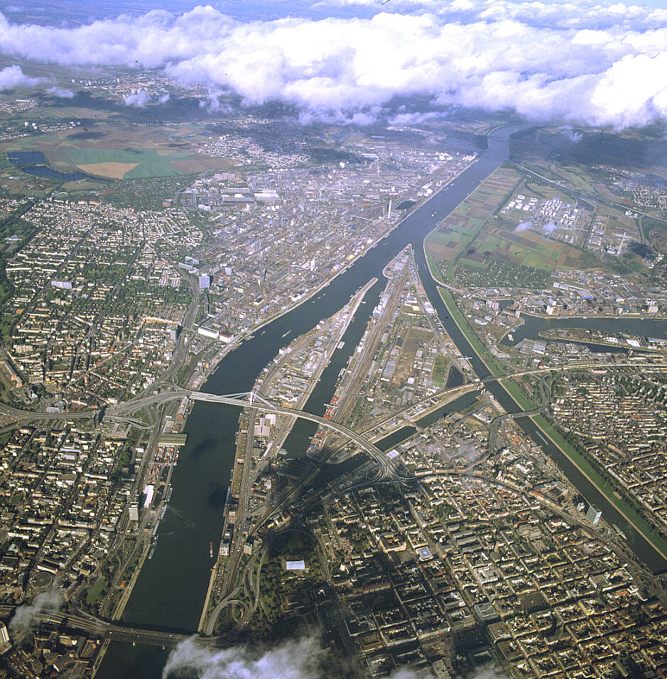 Innnstadt, Rhein und NeckarDer Mannheimer Handelshafen erstreckt sich westlich der Stadt im Dreieck zwischen Rhein und Neckar. Die Kurt-Schumacher-Brücke spannt sich als zweite Rheinbrücke über das Hafengelände und den Rhein |