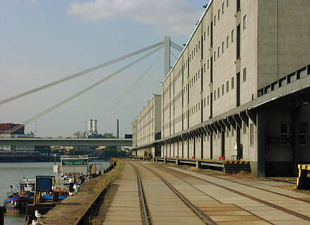 Lagerhäuser am Rhein, im Hintergrund die Kurt-Schumacher-Brücke über Hafengebiete und Rhein