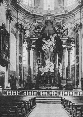 Hochaltar der Jesuitenkirche, nach Plänen von Paul Egell 1753 - 58 von P.A. von Verschaffelt ausgeführt, links eine der Hoflogen Ansicht vor 1940