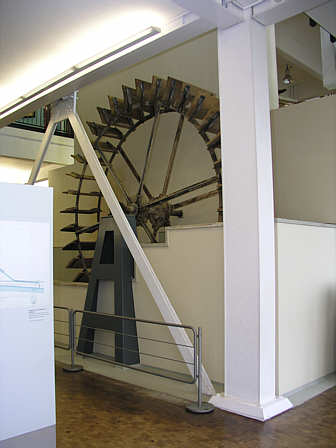 Wasserrad der Weberei Störr in Elzach Das Wasserrad erzeugte eine Drehenergie, die auf eine feststehende Welle übertragen wurde.
