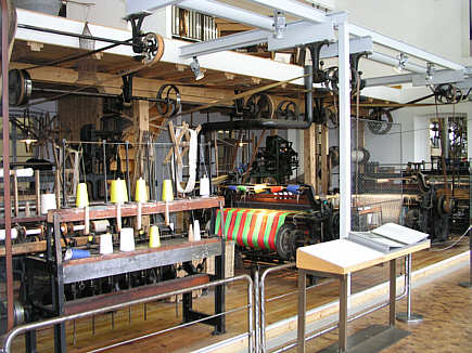 Mechanische Weberei der Familie Störr in Elzach mit sechs Webstühlen zur Herstellung von Zwilch, Drell, Leinen und anderen Stoffqualitäten.