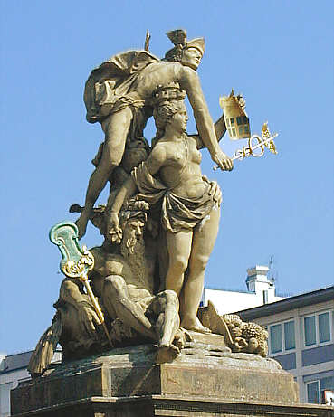 Vater Rhein, die Stadtgöttin (mit Stadtplan) und Merkur, der Gott des Handels