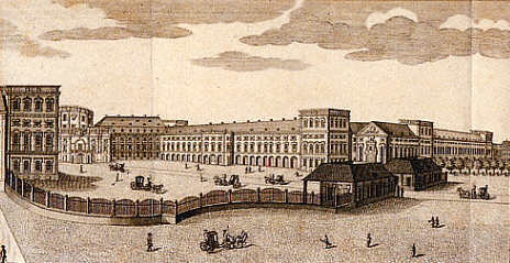 Das Schloss Perspektivisch nicht ganz korrekte Ansicht des kurfürstlichen Residenzschlosses. Im Vordergrund links der Ostflügel mit der Schlossbibliothek, rechts der Westflügel (Gerichtsflügel) mit der Schlosskirche. Den Ehrenhof schließt eine geschwungene Balsutrade mit zwei Wachhäuschen zur Stadt hin ab. |