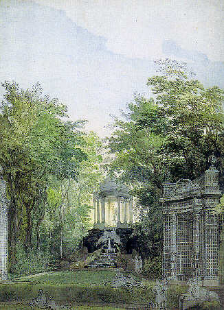 | Ferdinand von Kobell: Der Apollo-Tempel und das Naturtheater im Schwetzinger Schlosspark (Ansicht von Osten), um 1791 Schon 1761 wurde die Gestaltung des Naturtheaters im klassischen Sinn mit halbrundem, eingetieften Zuschauerraum und einer erhöhten, lweicht ansteigenden Bühne begonnen. Zu beiden Seiten des Proszeniums befanden sich Durchgänge aus einem hölzernen Gitterwerk mit Portalarchitektur. Diese wurden 1843 durch eine umstürzende Ulme zerstört und nicht wieder aufgebaut. Erst in unseren Tagen wurden an ihre Stelle Bäume gepflanzt, um die Raumwirkung wieder zu vermitteln. |