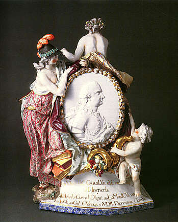 | Franz Conrad Linck: Apotheose des Kurfürstenpaares Carl Theodor und Elisabeth Auguste, Frankenthal 1769 Überaus reich bemaltes Miniaturdenkmal, bei dem Minerva das Medaillon mit dem Porträt des Kurfürsten, Apoll ein Medaillon der Kurfürstin hält. |