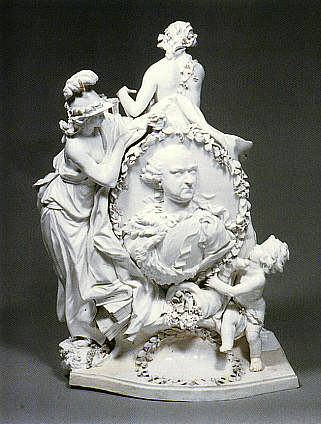 | Franz Conrad Linck: Apotheose des Kurfürstenpaares Carl Theodor und Elisabeth Auguste, Frankenthal 1769 Weiß belassene Ausformung der Huldigungsgruppe Nr. 5.4.1., das Medaillion des Kurfürsten zeigt hier eine plastischer modellierte Dreiviertelansicht, die von einer lockerer gefügten Girlande umgeben ist. |