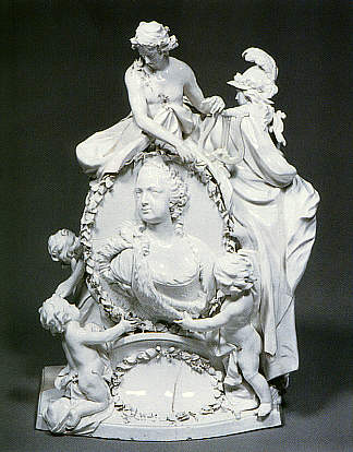 | Franz Conrad Linck: Apotheose des Kurfürstenpaares Carl Theodor und Elisabeth Auguste, Frankenthal 1769 Weiß belassene Ausformung der Huldigungsgruppe Nr. 5.4.1., auch das Medaillion der Kurfürstin zeigt hier eine plastischer modellierte Dreiviertelansicht, die von einer lockerer gefügten Girlande umgeben ist. |