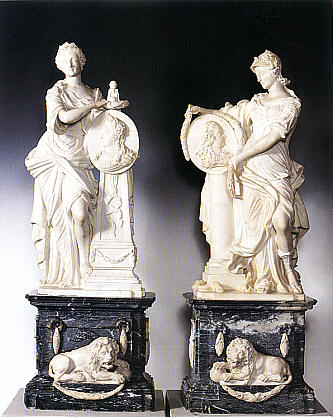 | Joseph Bäumgen: Apotheose des Kurfüsten Carl Theodor und der Kurfürstin Elisabeth Auguste, Marmorstatuetten, 1771 Auf grauen, mit dem pfälzischen Löwen verzierten Sockeln erheben sich an einen Säulenstumpf gelehnt die Figur der Minerva mit einem Medaillon des Kurfürsten (rechts) und an einen Obelisken gelehnt die weibliche allegorische Gestalt der Palatina mit dem Porträtmedaillon der Kurfürstin (links). |