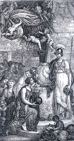 Die thronende Minerva weist auf ein Porträtmedaillon mit dem Bildnis