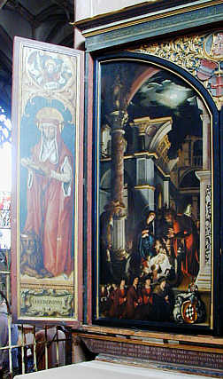 Sog. Oberriedaltar. Der Mittelteil besteht aus zwei Flügeln des von dem Basler Kaufmann Hans Oberried der Basler Kartause gestifteten und von Hans Holbein d.J. 1521 gemalten Altars. 1554 als Mittelteil des neuen Altars zusammengefügt und durch zwei neue Flügel. u.a. mit der Darstellung des hl. Hieronymus ergänzt.