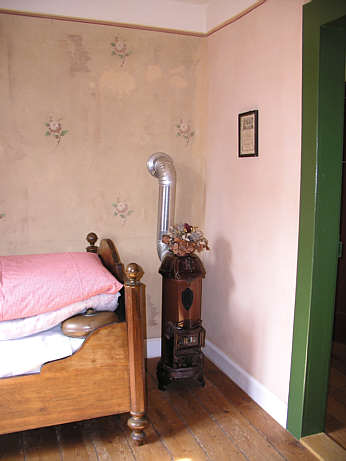 Schlafkammer im Obergeschoss. Ausstattung mit Bett und Schrank, dazu ein Kanonenofen. Wandbemalung mit Rosen auf altrosa Untergrund.