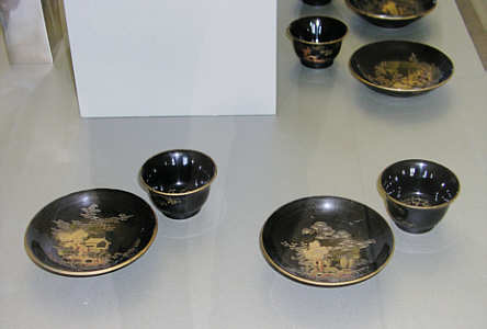 Schwartz Porcelain Set Teekoppchen mit Unterschalen Süddeutschland (?), 1. Viertel 18. Jh. Holz, Schwarzlack, Dekor in Gold Staatliche Schlösser und Gärten Baden-Württemberg (Rastatt, Schloss Favorite)