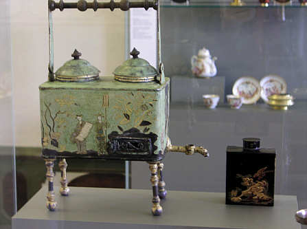 Schwartz Porcelain Teemaschine Süddeutschland {?), 1. Viertel 18. Jh. Blech, Lackmalerei in Gold und Braun auf grünem Grund Daneben Teebüchse Augsburg(?), 1.Viertel 18.Jh. Blech {?), Dekor in Lackmalerei Beides Staatliche Schlösser und Gärten Baden-Württemberg (Rastatt, Schloss Favorite)
