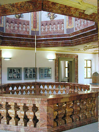 Von der Sala Terrena im Erdgeschoss bis zur Kuppel durchgehender Raum. An den Wänden Vitrinen mit den Kostümbildern der Markgrafen