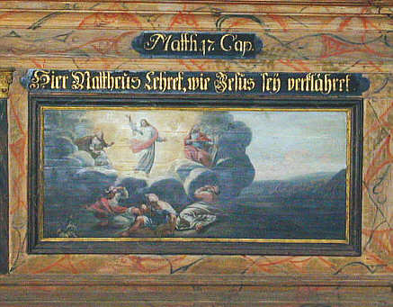 Bildfelder mit gereimten Lehrsprüchen: Hier Matthäus lehret / wie Jesus sich verkläret