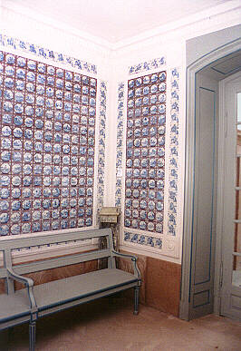 Schlossgarten SchwetzingenDurchgang zum ArboretumEinen intimen überdachten Durchgang zum privaten Teil des Schlossgartens, dem Arboretum, vermittelt dieser Raum, der ganz mit Delfter Kacheln ausgekleidet ist. Den Spuren den den Rändern der Kacheln nach zu urteilen waren diese Kacheln vorher an anderer Stelle angebracht, vermutlich in Düsseldorf, der Residenz des Kurfürsten Johann Wilhelm. |
