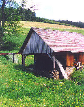 das Rad weg. Im Bild: Getreidemühle des Urishofes, Jostal, mit angeschobenem Überlauf |