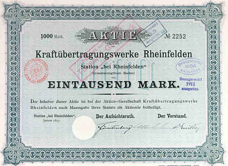 Die Gründung der Betriebsgesellschaft für das Wasserkraftwerk Rheinfelden war am 31. Oktober 1894 in Berlin. Die neue Aktiengesellschaft wurde als "Kraftübertragungsgesellschaft Rheinfelden, in Station bei Rheinfelden" in das Handelsregister eingetragen. Da aber die Genehmigung für die Nutzung der Wasserkraft jeweils aus der Schweiz und aus Deutschland erteilt werden mussten, ebenso wie weitere Änderungen im Bauplan, begann der Bau erst einmal mit Teilgenehmigungen.