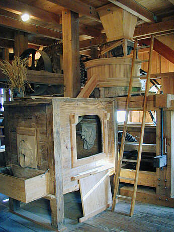 Oben der Einfülltrichter, darunter der Mühlenstuhl mit Läufer- und Bodenstein aus Sandstein, von dem aus das Mehl in den Mehlkasten fällt. Dort wird es im Beutelsichter ausgesiebt, der gröbere Anteil (Kleie und unfertig gemahlenes Mehl) fällt durch den Kleiekotzer in den Kleiekasten. |