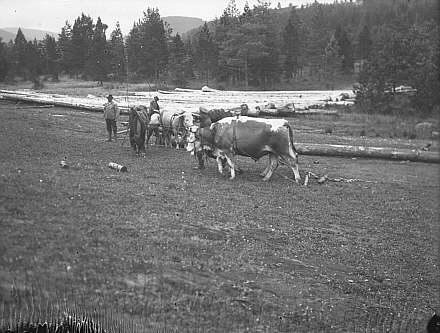 Ochsengespann, im Hintergrund das Holzlager