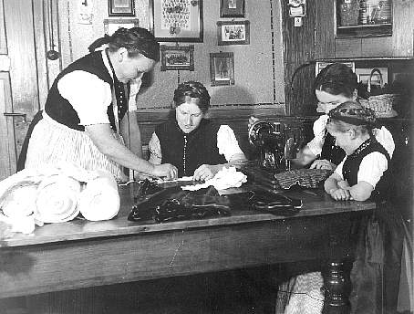 Trachtenschneiderinnen Während die Anfertigung der Männertracht Sache des Dorfschneiders war, stellte man die Frauen- und Mädchentracht auf den Höfen selbst her oder ließ die Trachtennäherin kommen. Näherin und Schneider arbeiteten "auf Stör", das heißt, sie kamen ins Haus und verarbeiteten dort gegen Tag- oder Stücklohn die vom Auftraggeber bereitgestellten Stoffe und Materialien. |