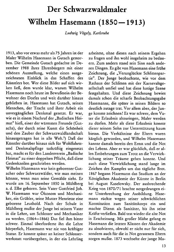 Ludwig Vögely: Der Schwarzwaldmaler Wilhelm Hasemann (1850 - 1913).