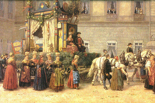 Der Festzug der Grünen Hochzeit. Detail: Der Aussteuerwagen mit Mädchen in Rippoldsauer Tracht