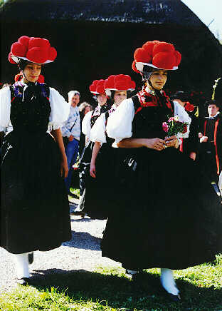 Die unverheirateten Frauen tragen das ärmellose Mieder mit der weißen Bluse, dazu als Kopfbedeckung über der Tüllhaube den roten Bollenhut.