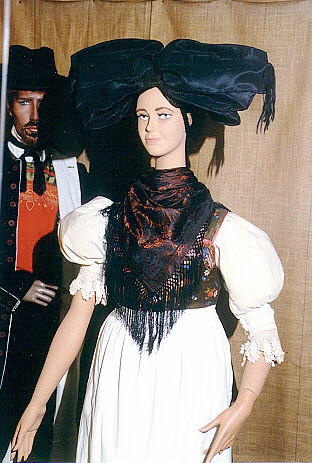 Tracht aus dem Hanauer Land, bestehend aus dem Fransentuch über der Brust und der großen Flügelhaube.
