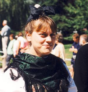 Die Frau trägt die Hanauer Hörnerkappe,