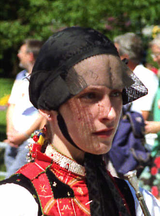 feine Stickerei.Die Haube wird unter dem Kinn mit Bändern