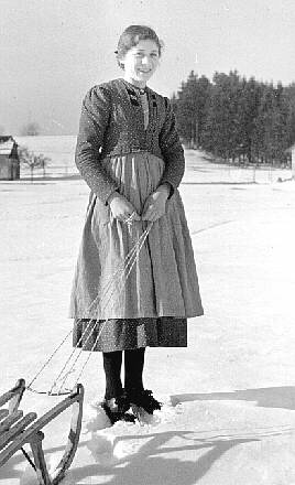 Bäuerliche AlltagskleidungMädchenkleidung, Winter Das Mädchen trägt hier ein Baumwollkleid mit einer Trägerschürze, darüber eine Jacke aus demselben Stoff wie das Kleid (Mädchen aus St. Peter)