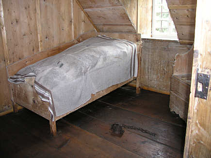 Arrestzelle (Karzer) im Dachgeschoss mit Bett, Nachtstuhl (rechts hinter der Tür) und am Boden befestigter Kette.
