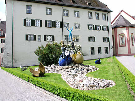 Skulpturengruppe (1989) aus drei großen farbigen Eiern, aus denen Menschen entsteigen.